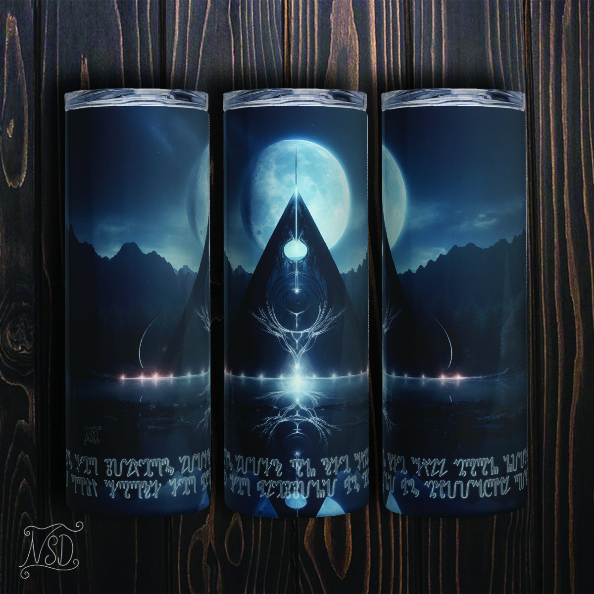 Mystical Reflection: Behold the magic of light and reflection with our Mystical Reflection tumbler. It captures a moment where earthly and celestial magick converge, with the Theban script weaving through the design: "By her silvery light on the full moon night I draw forth her blessing by magickal rite." This tumbler is a beacon for moonlit rituals and those who seek the moon's blessing.