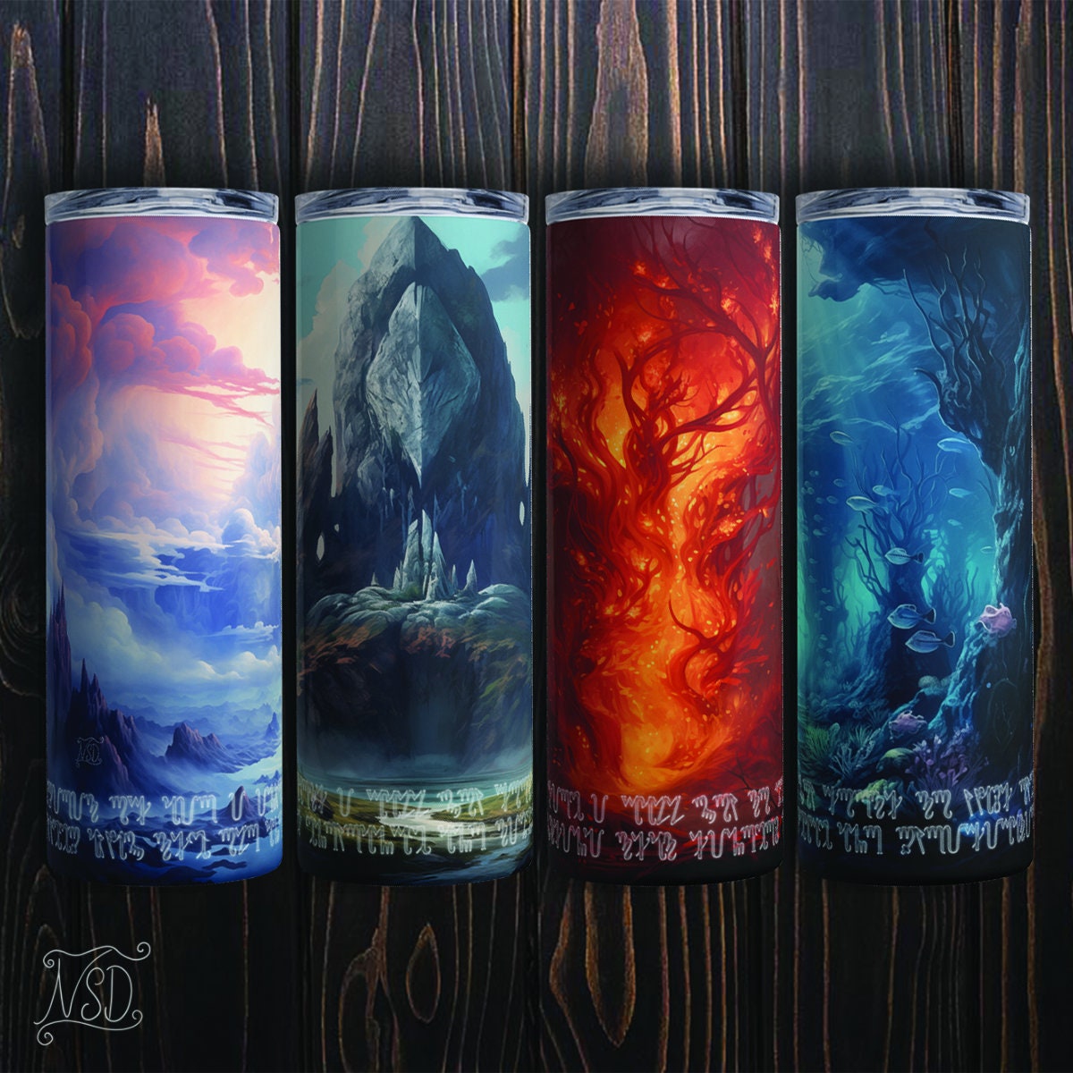 Immerse yourself in the primal forces of nature with our Elemental Essence Tumbler Set. Each tumbler is a chalice to the elements, meticulously designed to resonate with the energies of Earth, Air, Fire, and Water. Adorned with captivating landscapes and accompanied by sacred phrases, these tumblers are a daily ritual in themselves.